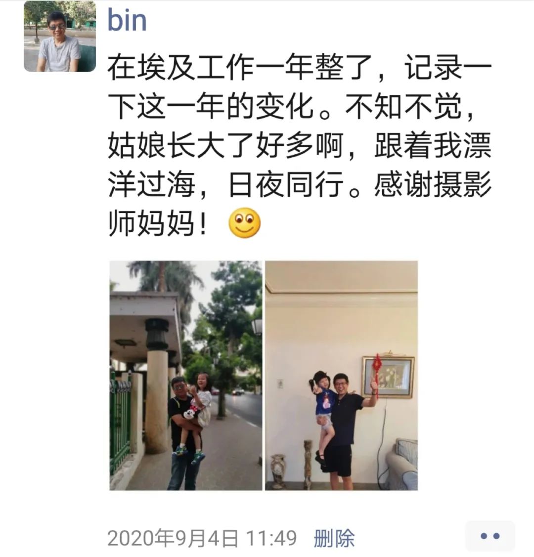 “拍摄者是孩子美丽的母亲,她辞掉国内工作随我赴任。正是家人的支持和鼓励,才使我在埃及的工作得以更好地开展。希望在未来的旅埃时间里 ,我可以更好地完成祖国交予我传播汉语和中华文化的使命。”